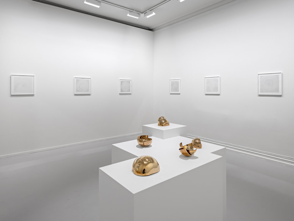 Jeg tilbrakte nesten tre timer i utstillingen. Det er ikke en utstilling man haster gjennom. Rommene er renskårne, nesten asketiske. Noen høyttalere, en benk, halverte syngeskåler i messing, tegninger mellom glass. Lite å «se» i tradisjonell forstand. Likevel fylles rommene av noe insisterende: lyd som beveger seg mellom veggene – og mellom kroppene som befinner seg der.